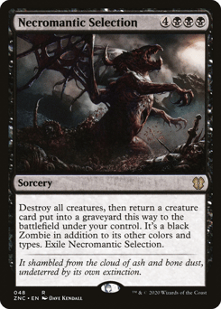 Destroy all creatures, then return a creature card put into a graveyard this way to the battlefield under your control. It's a black Zombie in addition to its other colors and types. Exile Necromantic Selection.