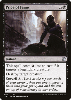 This spell costs {2} less to cast if it targets a legendary creature. Destroy target creature. Surveil 2. (Look at the top two cards of your library, then put any number of them into your graveyard and the rest on top of your library in any order.)