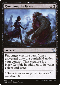 Put target creature card from a graveyard onto the battlefield under your control. That creature is a black Zombie in addition to its other colors and types.