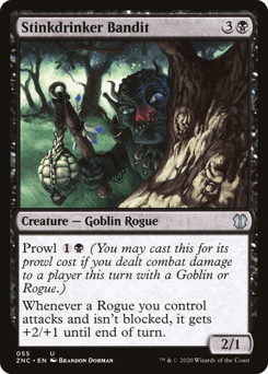 Prowl {1}{B} (You may cast this for its prowl cost if you dealt combat damage to a player this turn with a Goblin or Rogue.) Whenever a Rogue you control attacks and isn't blocked, it gets +2/+1 until end of turn.