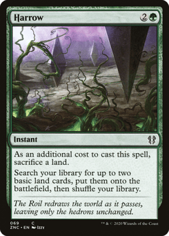 As an additional cost to cast this spell, sacrifice a land. Search your library for up to two basic land cards, put them onto the battlefield, then shuffle.