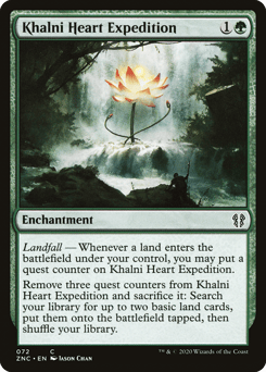 Landfall — Whenever a land you control enters, you may put a quest counter on this enchantment. Remove three quest counters from this enchantment and sacrifice it: Search your library for up to two basic land cards, put them onto the battlefield tapped, then shuffle.