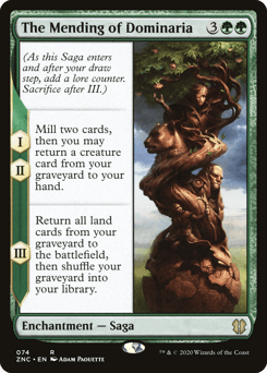 (As this Saga enters and after your draw step, add a lore counter. Sacrifice after III.) I, II — Mill two cards, then you may return a creature card from your graveyard to your hand. III — Return all land cards from your graveyard to the battlefield, then shuffle your graveyard into your library.