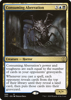 Consuming Aberration's power and toughness are each equal to the number of cards in your opponents' graveyards. Whenever you cast a spell, each opponent reveals cards from the top of their library until they reveal a land card, then puts those cards into their graveyard.