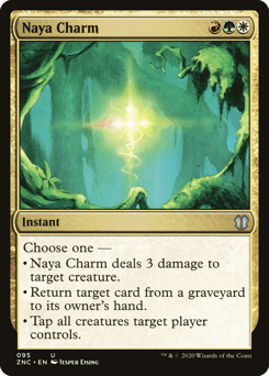 Choose one — • Naya Charm deals 3 damage to target creature. • Return target card from a graveyard to its owner's hand. • Tap all creatures target player controls.