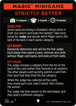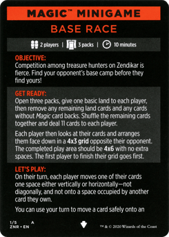 2 players | 2 packs | 10 minutes OBJECTIVE: Best your opponent in a series of fast Magic games using only the cards in a single pack! GET READY: Each player opens a pack and makes four face-down piles of three cards each using the Magic cards inside. Players make their piles with the goal of winning a series of Magic games with these modified rules: Players start at 5 life, have infinite mana, and cannot lose by drawing from an empty library. LET'S PLAY: Randomly determine who goes first. Each player chooses which pile their opponent will use for each round. Then both players draw all three of their cards and play a game of Magic. When a player loses a game, they get to go first in the next game. TO WIN: The first player to win two games wins the match.