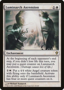 At the beginning of each opponent's end step, if you didn't lose life this turn, you may put a quest counter on this enchantment. (Damage causes loss of life.) {1}{W}: Create a 4/4 white Angel creature token with flying. Activate only if this enchantment has four or more quest counters on it.