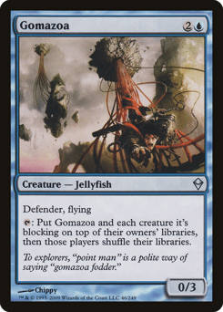 Defender, flying {T}: Put this creature and each creature it's blocking on top of their owners' libraries, then those players shuffle.