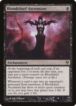 At the beginning of each end step, if an opponent lost 2 or more life this turn, you may put a quest counter on this enchantment. (Damage causes loss of life.) Whenever a card is put into an opponent's graveyard from anywhere, if this enchantment has three or more quest counters on it, you may have that player lose 2 life. If you do, you gain 2 life.