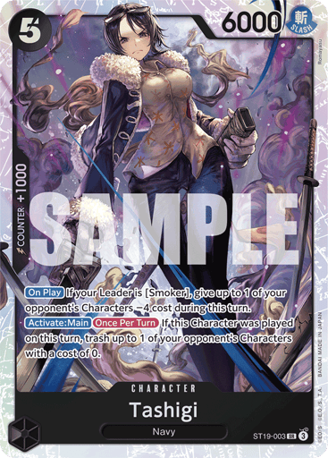 [On Play] If your Leader is [Smoker], give up to 1 of your opponent's Characters −4 cost during this turn. [Activate: Main] [Once Per Turn] If this Character was played on this turn, trash up to 1 of your opponent's Characters with a cost of 0.