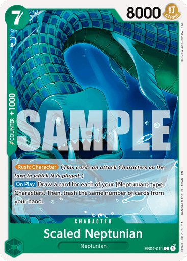 [Rush: Character] (This card can attack Characters on the turn in which it is played.) [On Play] Draw a card for each of your {Neptunian} type Characters. Then, trash the same number of cards from your hand.