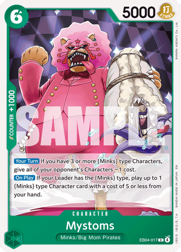 [Your Turn] If you have 3 or more {Minks} type Characters, give all of your opponent's Characters −1 cost. [On Play] If your Leader has the {Minks} type, play up to 1 {Minks} type Character card with a cost of 5 or less from your hand.