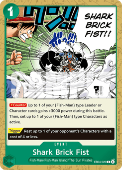 [Counter] Up to 1 of your {Fish-Man} type Leader or Character cards gains +3000 power during this battle. Then, set up to 1 of your {Fish-Man} type Characters as active. [Trigger] Rest up to 1 of your opponent's Characters with a cost of 4 or less.