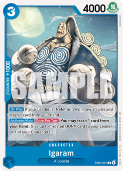 [On Play] If your Leader is [Nefeltari Vivi], draw 2 cards and trash 1 card from your hand. [Activate: Main] [Once Per Turn] You may trash 1 card from your hand: Give up to 1 rested DON!! card to your Leader or 1 of your Characters.
