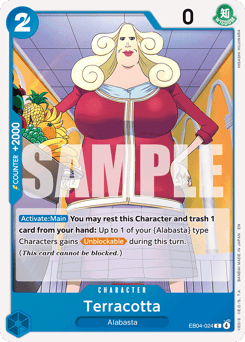[Activate: Main] You may rest this Character and trash 1 card from your hand: Up to 1 of your {Alabasta} type Characters gains [Unblockable] during this turn.(This card cannot be blocked.)