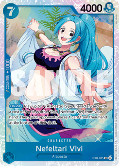 [On Play] Play up to 1 {Alabasta} type Character card with a cost of 8 or less other than [Nefeltari Vivi] from your hand. Then, your opponent places 1 card from their hand at the bottom of their deck.