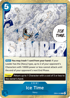 [Main] You may trash 1 card from your hand: If your Leader has the {Navy} type, up to 2 of your opponent's Characters with 10000 power or less cannot attack until the end of your opponent's next End Phase. [Trigger] Return up to 1 Character with a cost of 5 or less to the owner's hand.