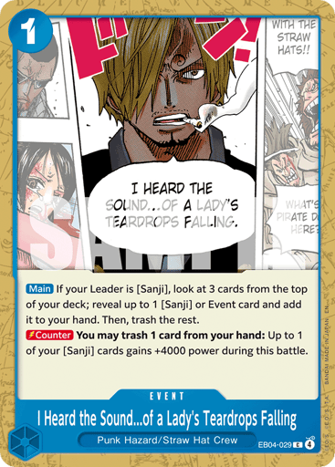 [Main] If your Leader is [Sanji], look at 3 cards from the top of your deck; reveal up to 1 [Sanji] or Event card and add it to your hand. Then, trash the rest. [Counter] You may trash 1 card from your hand: Up to 1 of your [Sanji] cards gains +4000 power during this battle.