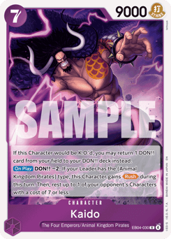 [Main] You may rest 6 of your DON!! cards: Up to 1 of your [Kaido] cards gains +3000 power during this turn. Then, rest up to 1 of your opponent's Characters. [Counter] DON!! −1: Your Leader gains +4000 power during this battle.