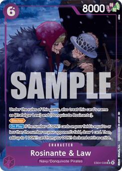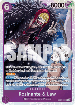 Under the rules of this game, also treat this card's name as [Trafalgar Law] and [Donquixote Rosinante]. [Blocker] [On Play] If the number of DON!! cards on your field is equal to or less than the number on your opponent's field, draw 1 card. Then, add up to 1 DON!! card from your DON!! deck and set it as active.