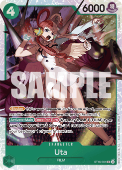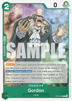 [Blocker] (After your opponent declares an attack, you may rest this card to make it the new target of the attack.) [On Your Opponent's Attack] You may trash any number of {Music} type cards from your hand. Your Leader or 1 of your Characters gains +1000 power during this battle for every card trashed.