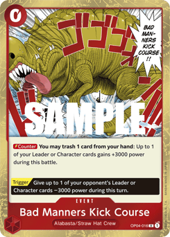[Counter] You may trash 1 card from your hand: Up to 1 of your Leader or Character cards gains +3000 power during this battle. [Trigger] Give up to 1 of your opponent's Leader or Character cards −3000 power during this turn.