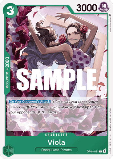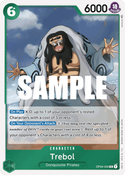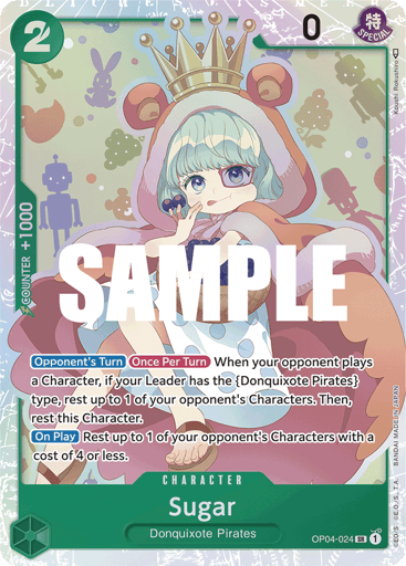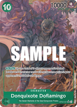 [Opponent's Turn] [Once Per Turn] When your opponent plays a Character, if your Leader has the {Donquixote Pirates} type, rest up to 1 of your opponent's Characters. Then, rest this Character. [On Play] Rest up to 1 of your opponent's Characters with a cost of 4 or less.
