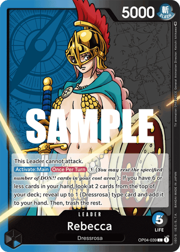 [On Play] Look at 3 cards from the top of your deck; reveal up to 1 {Dressrosa} type card other than [Rebecca] and add it to your hand. Then, trash the rest.