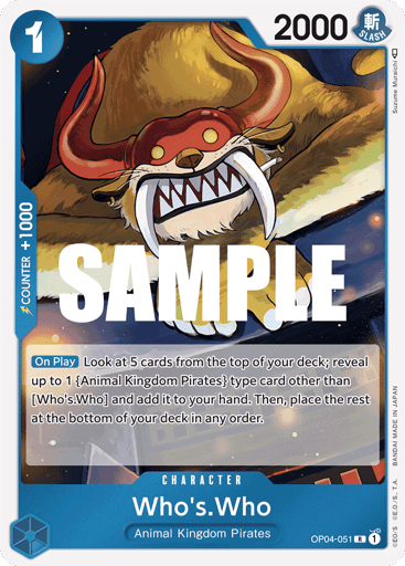 [On Play] Look at 5 cards from the top of your deck; reveal up to 1 {Animal Kingdom Pirates} type card other than [Who's.Who] and add it to your hand. Then, place the rest at the bottom of your deck in any order.