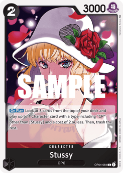 [On Play] Look at 3 cards from the top of your deck and play up to 1 Character card with a type including "CP" other than [Stussy] and a cost of 2 or less. Then, trash the rest.