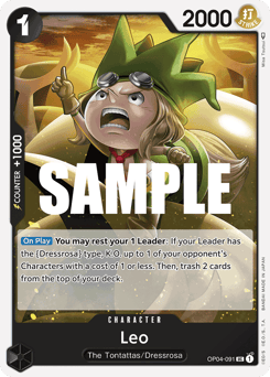 [On Play] You may rest your 1 Leader: If your Leader has the {Dressrosa} type, K.O. up to 1 of your opponent's Characters with a cost of 1 or less. Then, trash 2 cards from the top of your deck.