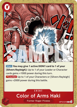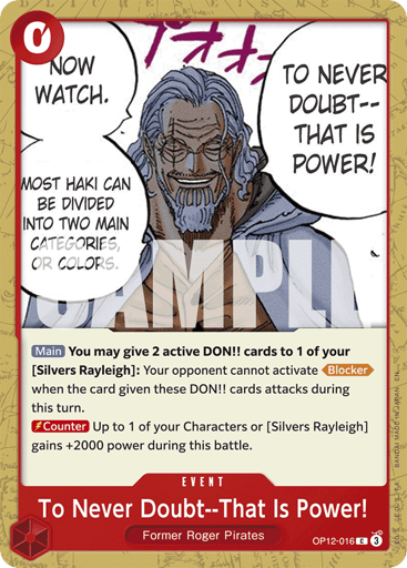 [Main] You may give 2 active DON!! cards to 1 of your [Silvers Rayleigh]: Your opponent cannot activate [Blocker] when the card given these DON!! cards attacks during this turn. [Counter] Up to 1 of your Characters or [Silvers Rayleigh] gains +2000 power during this battle.