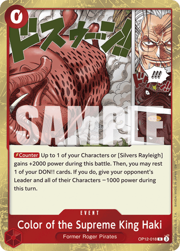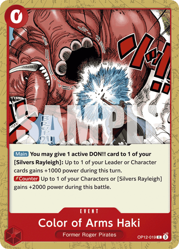 [Main] You may give 1 active DON!! card to 1 of your [Silvers Rayleigh]: Look at 4 cards from the top of your deck; reveal up to 1 red Event or up to 1 Character card with a cost of 3 or more and add it to your hand. Then, place the rest at the bottom of your deck in any order.