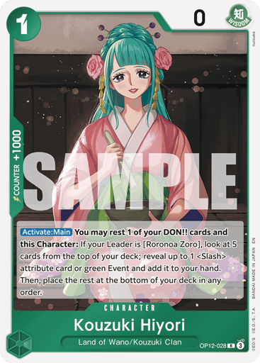 [Activate: Main] You may rest 1 of your DON!! cards and this Character: If your Leader is [Roronoa Zoro], look at 5 cards from the top of your deck; reveal up to 1 <Slash> attribute card or green Event and add it to your hand. Then, place the rest at the bottom of your deck in any order.