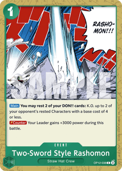 [Main] You may rest 2 of your DON!! cards: K.O. up to 2 of your opponent's rested Characters with a base cost of 4 or less. [Counter] Your Leader gains +3000 power during this battle.