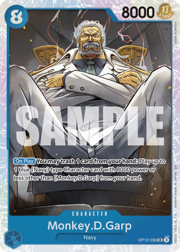 [On Play] You may trash 1 card from your hand: Play up to 1 blue {Navy} type Character card with 8000 power or less other than [Monkey.D.Garp] from your hand.