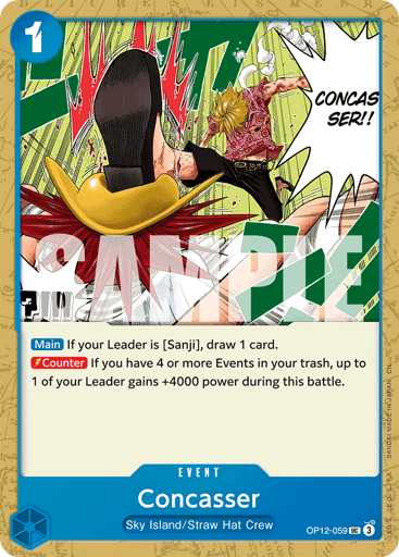[Main] If your Leader is [Sanji], draw 1 card. [Counter] If you have 4 or more Events in your trash, up to 1 of your Leader gains +4000 power during this battle.