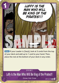 [Main] If your Leader is [Sanji], look at 3 cards from the top of your deck and add up to 1 card to your hand. Then, place the rest at the bottom of your deck in any order.