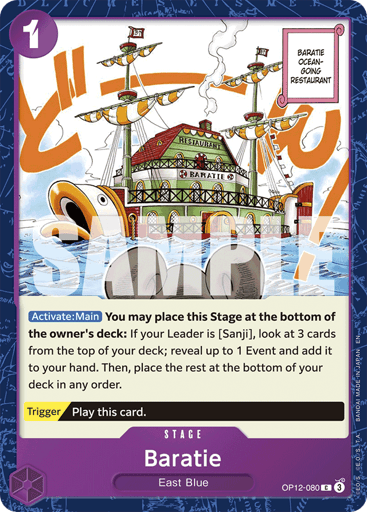 [Activate: Main] You may place this Stage at the bottom of the owner's deck: If your Leader is [Sanji], look at 3 cards from the top of your deck; reveal up to 1 Event and add it to your hand. Then, place the rest at the bottom of your deck in any order. [Trigger] Play this card.