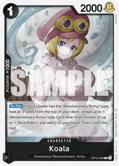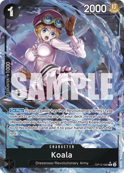 [On Play] If your Leader has the {Revolutionary Army} type, look at 3 cards from the top of your deck; reveal up to 1 {Revolutionary Army} type card other than [Koala] or up to 1 [Nico Robin] and add it to your hand. Then, trash the rest.