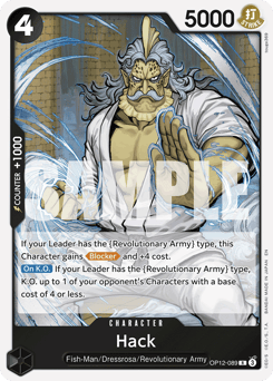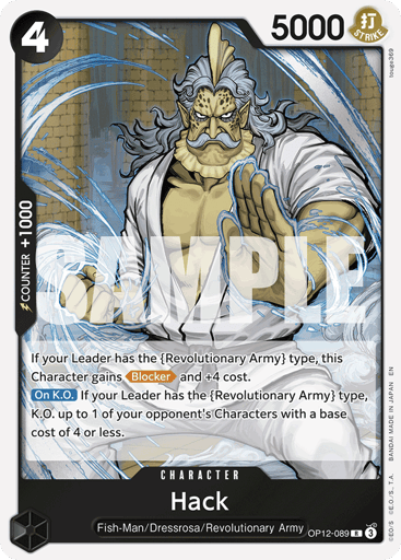 If your Leader has the {Revolutionary Army} type, this Character gains [Blocker] and +4 cost. [On K.O.] If your Leader has the {Revolutionary Army} type, K.O. up to 1 of your opponent's Characters with a base cost of 4 or less.