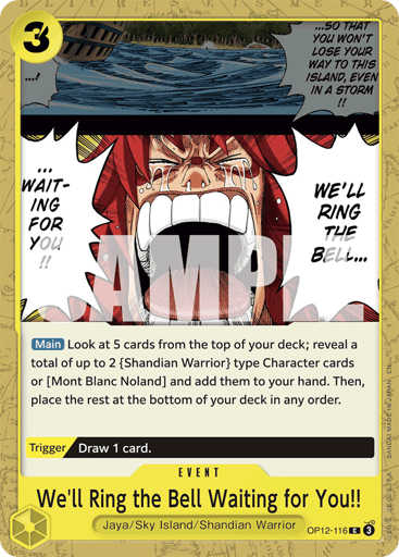 [Main] Look at 5 cards from the top of your deck; reveal a total of up to 2 {Shandian Warrior} type Character cards or [Mont Blanc Noland] and add them to your hand. Then, place the rest at the bottom of your deck in any order. [Trigger] Draw 1 card.