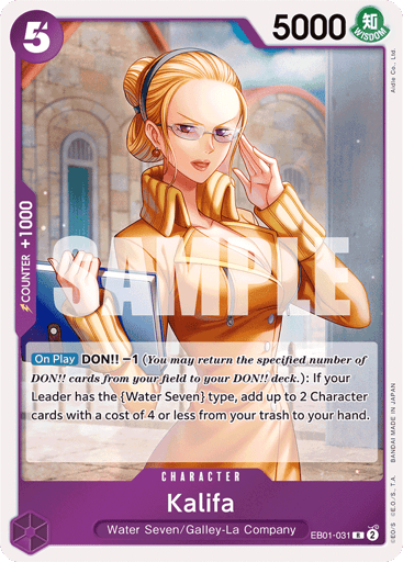 [On Play] DON!! -1 (You may return the specified number of DON!! cards from your field to your DON!! deck.): If your Leader has the {Water Seven} type, add up to 2 Character cards with a cost of 4 or less from your trash to your hand.