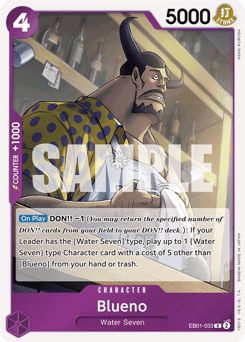 [On Play] DON!! -1 (You may return the specified number of DON!! cards from your field to your DON!! deck.): If your Leader has the {Water Seven} type, play up to 1 {Water Seven} type Character card with a cost of 5 other than [Blueno] from your hand or trash.