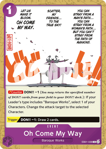 [Counter] DON!! -1 (You may return the specified number of DON!! cards from your field to your DON!! deck.): If your Leader's type includes "Baroque Works", select 1 of your Characters. Change the attack target to the selected Character. [Trigger] DON!! -1: Draw 2 cards.