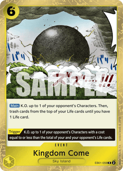[Main] K.O. up to 1 of your opponent's Characters. Then, trash cards from the top of your Life cards until you have 1 Life card. [Trigger] K.O. up to 1 of your opponent's Characters with a cost equal to or less than the total of your and your opponent's Life cards.