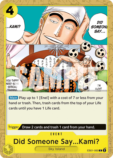 [Main] Play up to 1 [Enel] with a cost of 7 or less from your hand or trash. Then, trash cards from the top of your Life cards until you have 1 Life card. [Trigger] Draw 2 cards and trash 1 card from your hand.