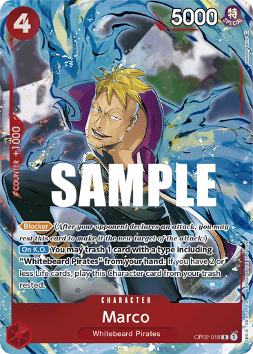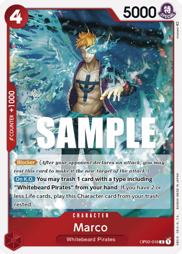 [Blocker] (After your opponent declares an attack, you may rest this card to make it the new target of the attack.) [On K.O.] You may trash 1 card with a type including "Whitebeard Pirates" from your hand: If you have 2 or less Life cards, play this Character card from your trash rested.