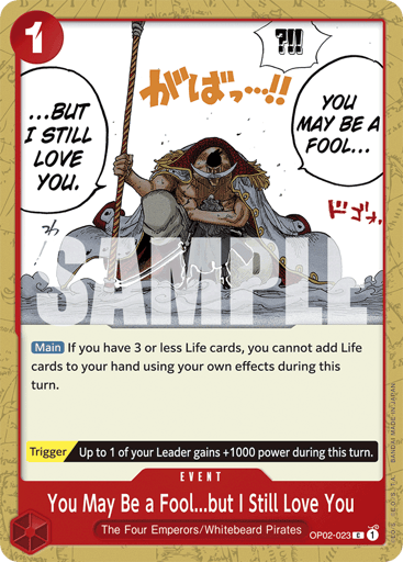 [Main] If you have 3 or less Life cards, you cannot add Life cards to your hand using your own effects during this turn. [Trigger] Up to 1 of your Leader gains +1000 power during this turn.