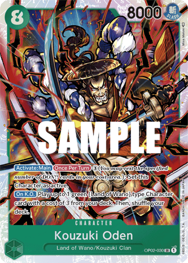 [Activate: Main] [Once Per Turn] ③ (You may rest the specified number of DON!! cards in your cost area.): Set this Character as active. [On K.O.] Play up to 1 green {Land of Wano} type Character card with a cost of 3 from your deck. Then, shuffle your deck.